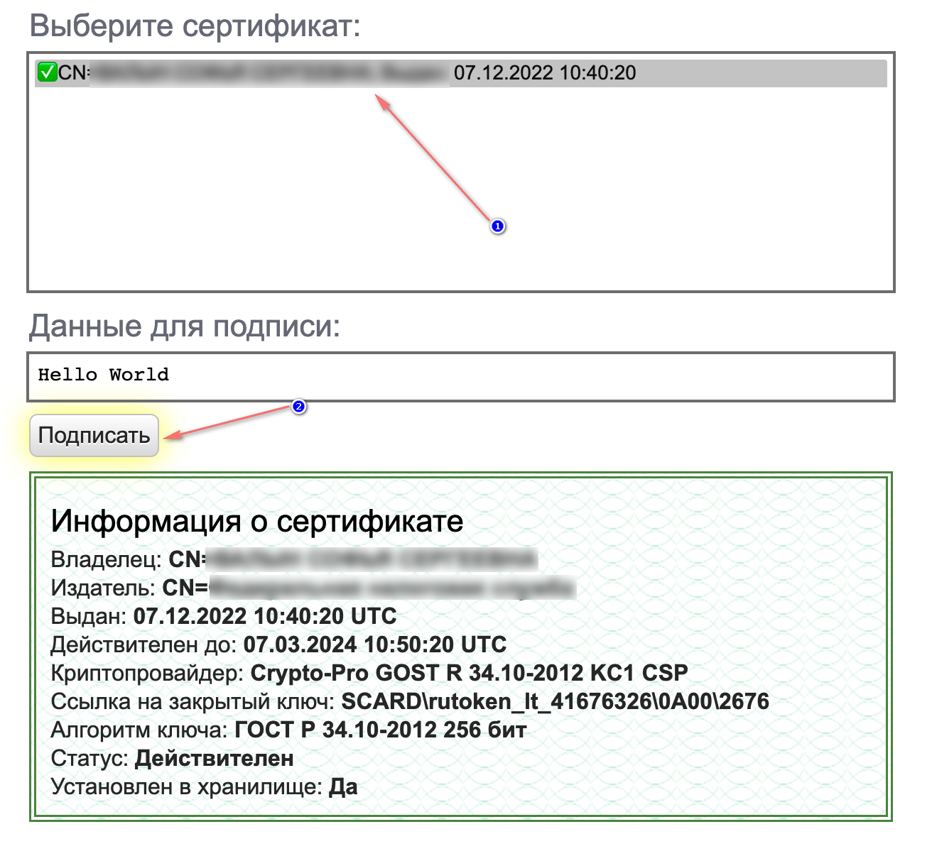 4. Выберите[^1] нужный сертификат и нажмите "Подписать". Если ни один сертификат не отобразился, значит плагин его не нашел. Проверьте, что USB-носитель с ЭЦП вставлен в компьютер или что ЭЦП сохранена в реестре этого компьютера.